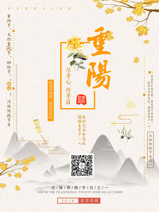 每年的农历九月初九日,是中华民族的传统节日:重阳节。《易经》中把“九”定为阳数,九月九日,两九相重,故曰“重阳”;因日与月皆逢九,故又称为“重九”。九九归真,一元肇始,古人认为九九重阳为吉祥之日。古时民间在重阳节有登高祈福、赏菊、佩茱萸、祭祖及饮宴求寿等习俗。流传至今,添加了敬老等内涵,于重阳之日享宴高会(举行敬老宴),感恩敬老。登高秋游与感恩敬老是当今重阳节日活动的两大重要主题。
