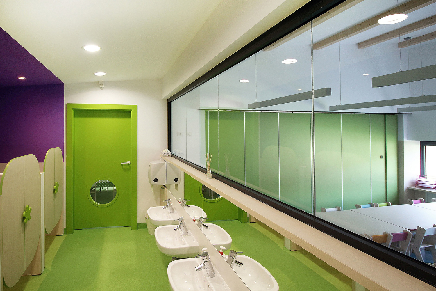 有屋顶的凉亭结束了整个建筑结构。凉亭既是精致也是观众。它是最重要的一部分,因为它影响了建筑体量的形状。因为建筑体量的规模,入口的高度、屋顶和窗台都居于了次级地位。入口和屋顶的高度都是2.3米,这样设计是为了让孩子们进入建筑体量后产生一种“家”的感觉。为了孩子,91免费看片网站特意降低了建筑体量的高度,以让孩子们产生这是专门为他们设计的幼儿园的感觉。教室中的窗户很长,配备有很低的过量以适应孩子们的身高。因此对孩子们来说它们显得更容易接近,并帮助了孩子们与外部空间之间的接触。