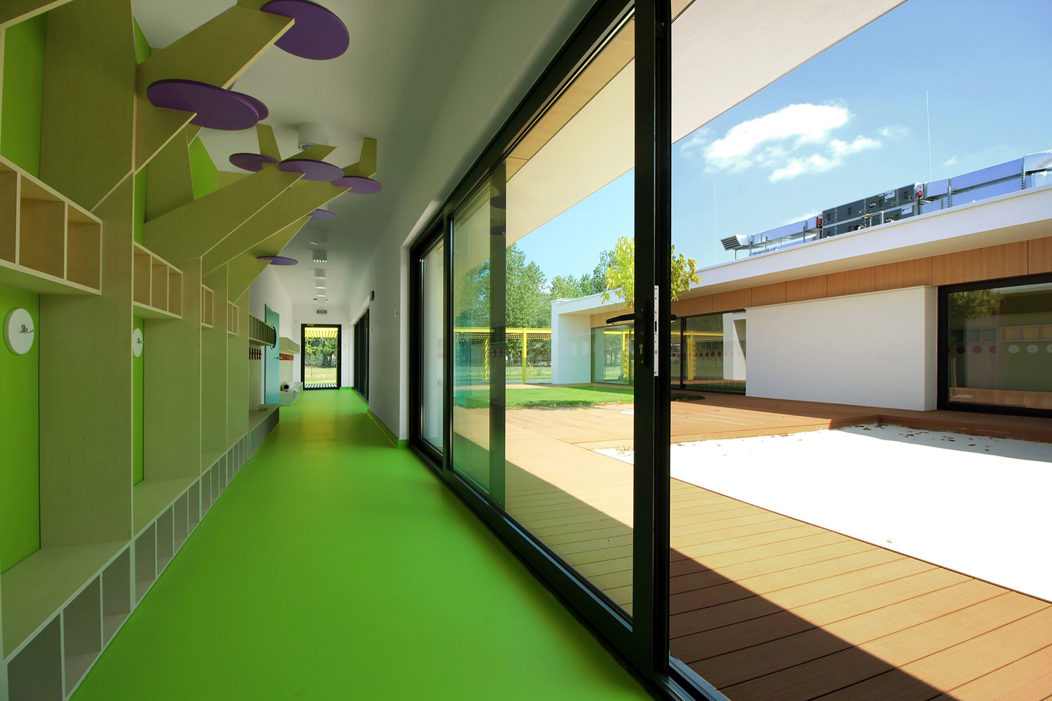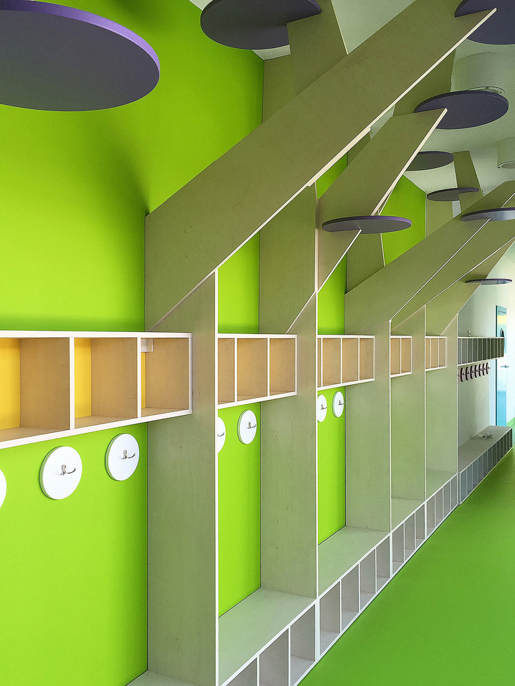 幼儿园是一层楼的设计,这个门廊般的建筑体量中有五个房间,两间为托儿所准备,剩下三间为幼儿园所用。项目可以容纳125个孩子。项目单斜面的屋顶使用的是胶合层压的木结构。内部庭院中有沙坑和树,是“建筑体量的核心”。庭院处的墙壁上有一扇大窗户向中庭敞开,这带来了最大限度的自然光线。衣帽间和教室直接的联系着。衣帽间中的窗户可以滑动打开,以便于孩子们以尽可能短的方式达到花园。玻璃的走廊和低的屋顶是庭院的通道。它们模糊了内外部空间之间的界限。