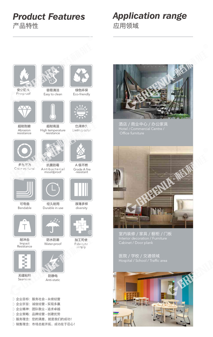 1)绿色环保 2)价格合理 3)防水和烟灼性 4)耐磨耐刮 5)易于清洁 6)抗菌的特性